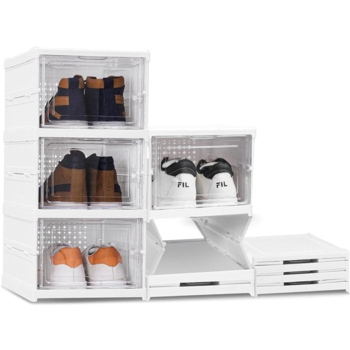 SNEAKER BOX: These 4,5,6 tier sneaker racks for home are amazing and come in white color for keeping your shoes organized. The elegant clear front door can be easily opened & closed, allowing your shoes to be displayed and finding the right shoes easily without opening all the boxes. Perfect for sneakers, flats, flip-flops, sandals, sport shoes, loafers and wedges. The foldable design allows you to fold and unfold it anytime, and avoids occupying space